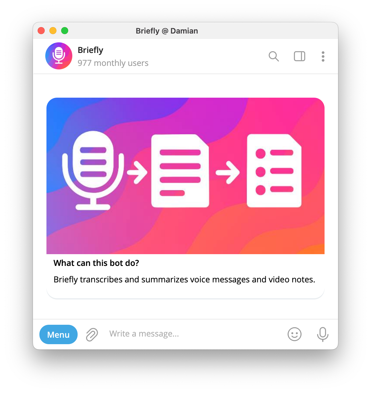 Briefly is a Telegram bot that transcribes and summarizes voice messages, audio recordings, and video notes, helping creators and teams save time when dealing with long or hard-to-listen messages.