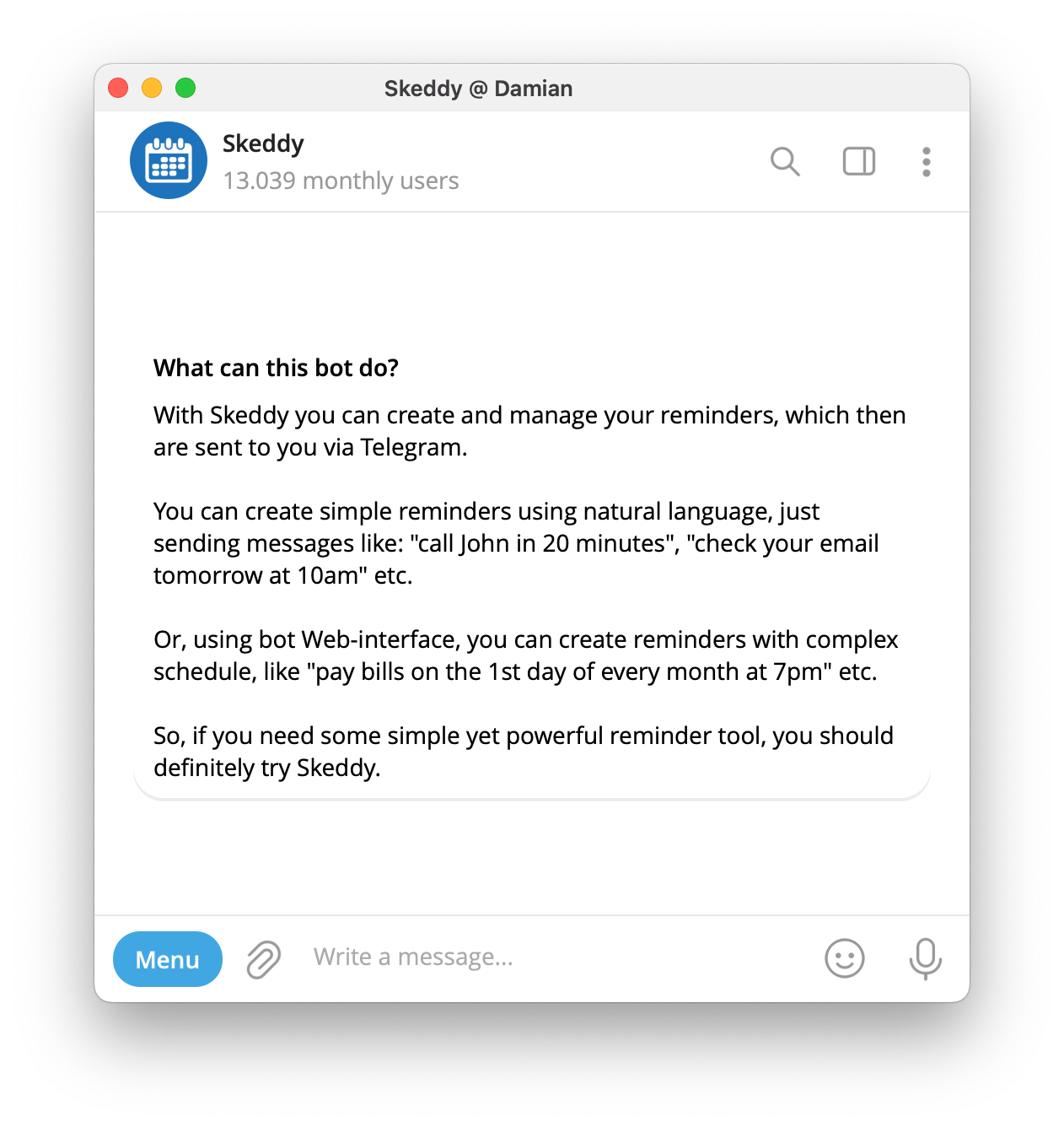 @SkeddyBot lets you create reminders and task alerts using simple messages or natural language. You can set one-time or recurring reminders for anything from post deadlines to team events. This helps you stay organized and consistent without leaving Telegram.