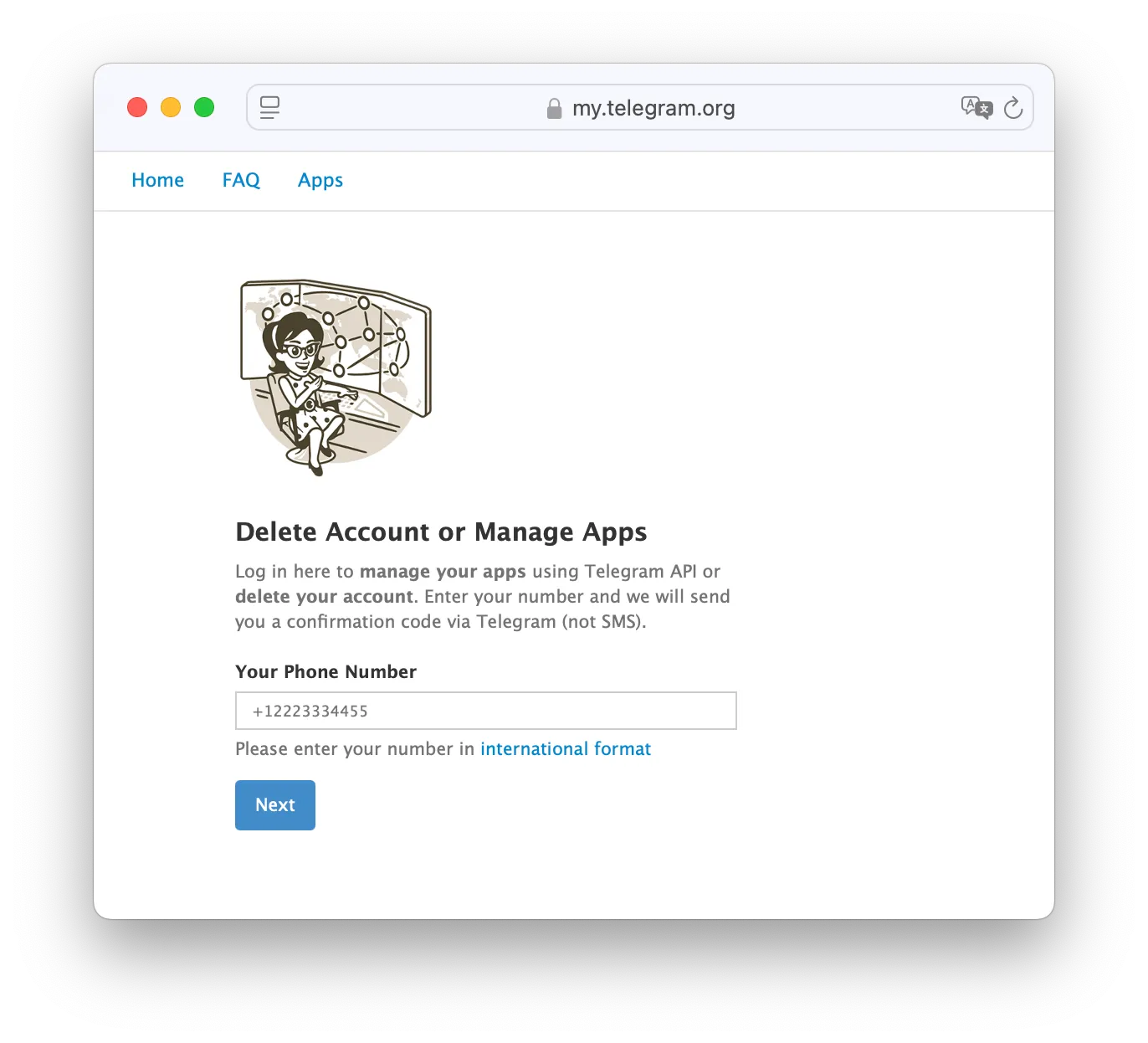- Open the Telegram Deactivation Page: Launch a web browser on your computer or phone and go to the official Telegram account deletion page at my.telegram.org. (Using a desktop browser is recommended for ease of copying the code and navigating, but a mobile browser works as well.)