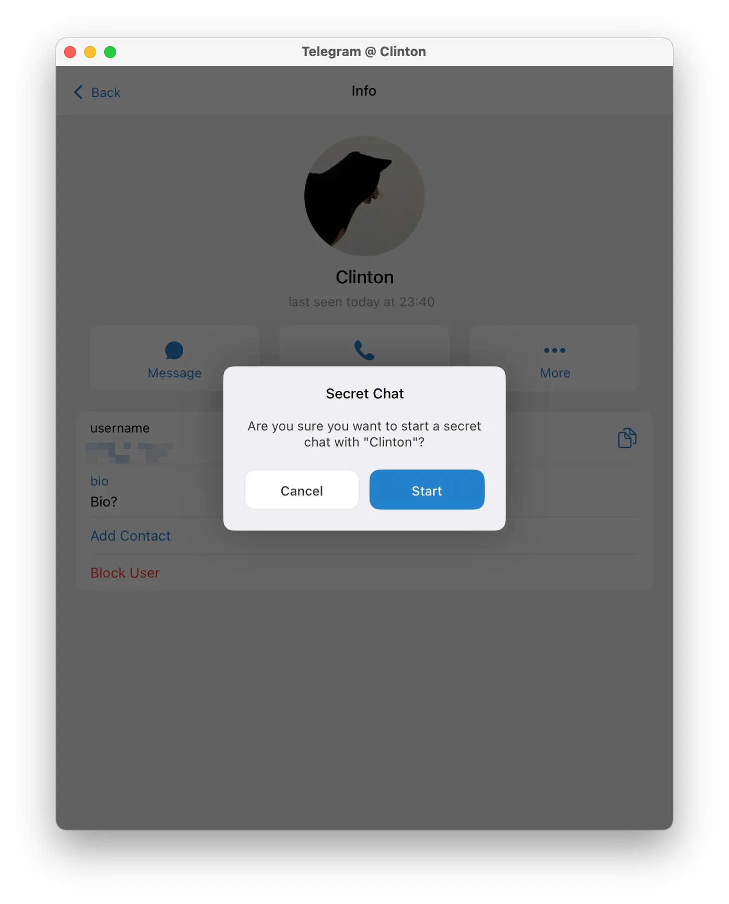 Select Start Secret Chat. Telegram will confirm that the conversation uses end-to-end encryption and remains device-specific.