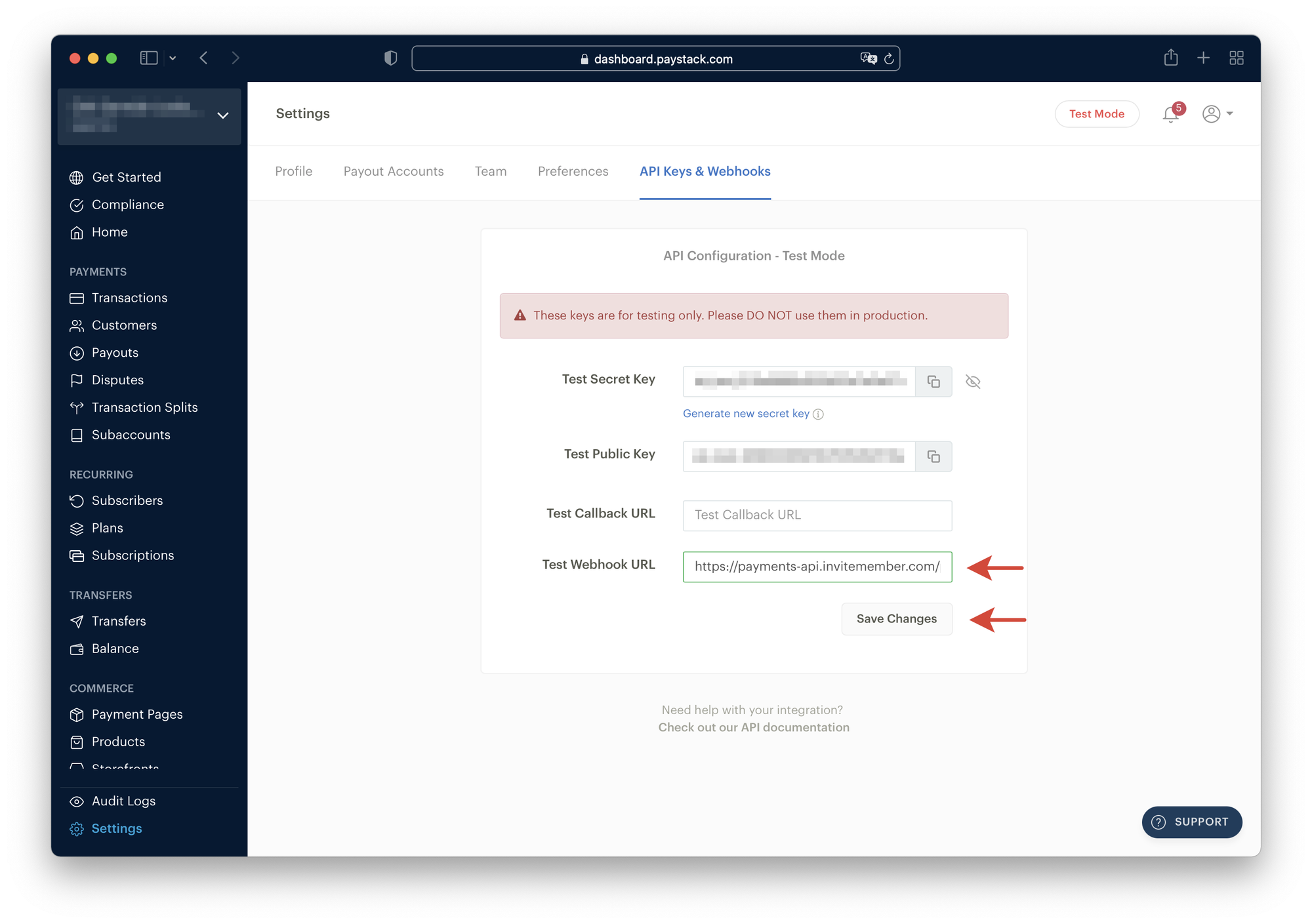 - Copy the webhook URL shown by InviteMember and paste it back in Paystack (API Keys & Webhooks → Webhook URL). Save.
