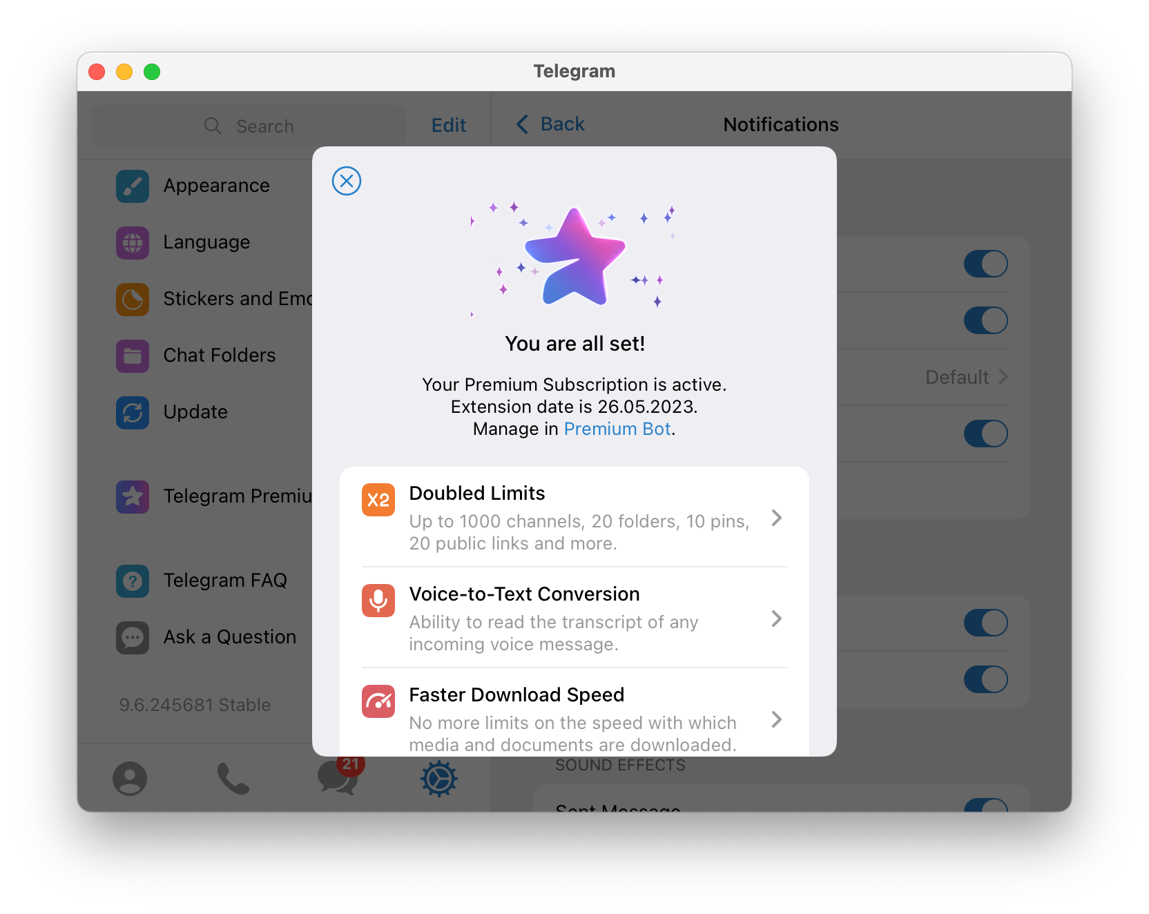 - Doubled Limits: Enjoy increased limits for channels, chat folders, accounts, pinned chats, favorite stickers, and more.