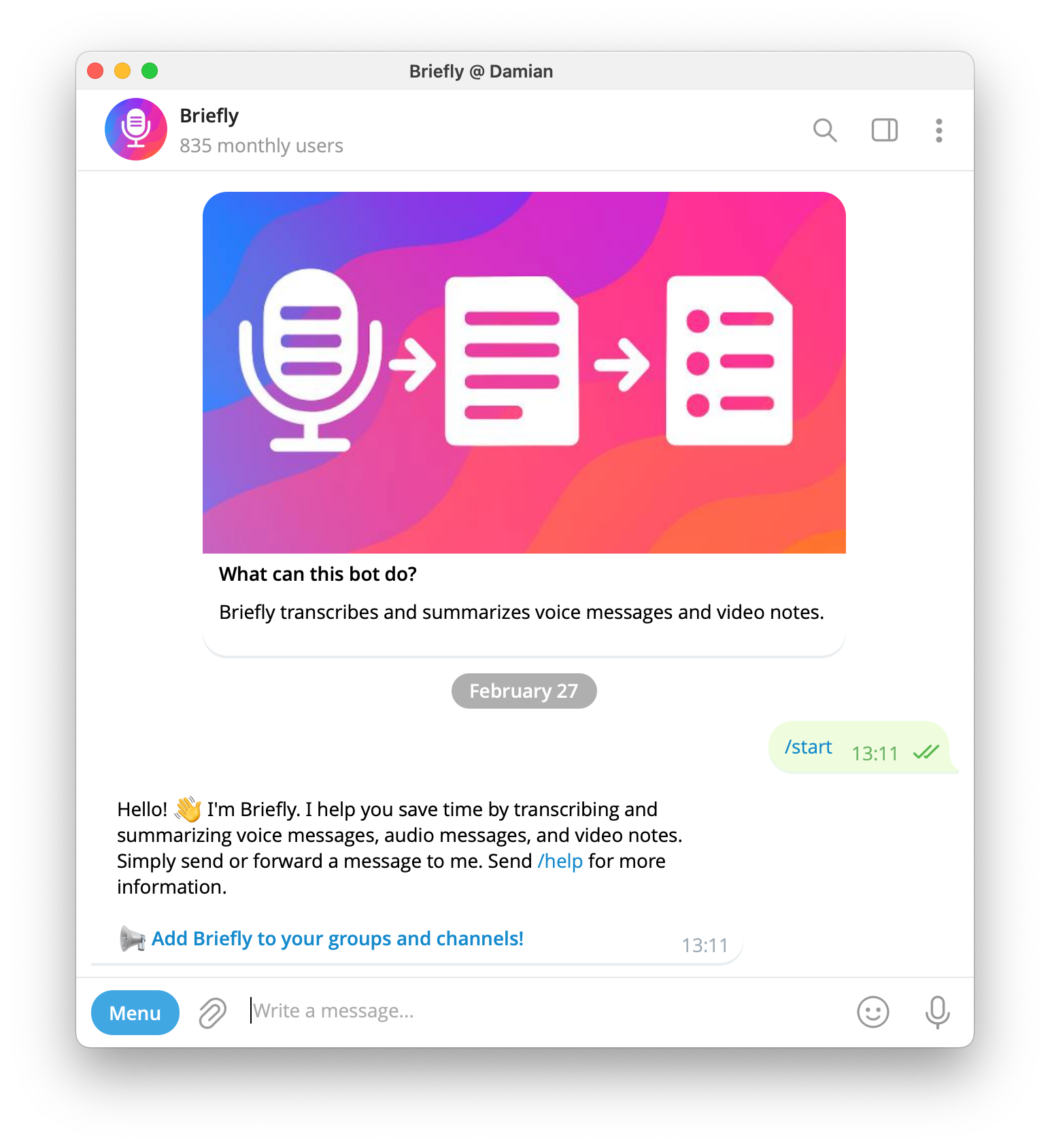 Signal also does not offer a public Bot API for subscription management, automated access control, or in-chat payment workflows.