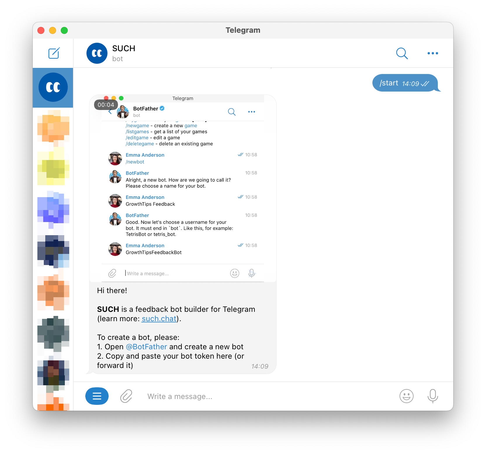 - Branded Custom Bots: Businesses can create a custom bot with their own name, logo and description, that can be started by any Telegram user. This allows for real-time, personalized interactions with customers. SUCH Pro users can also remove SUCH branding from their bots.