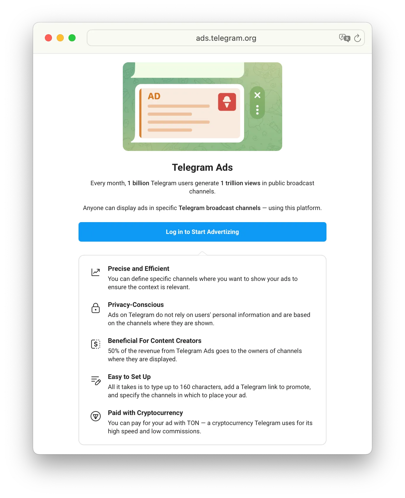 - Payments: Ads are bought with Toncoin (TON); Telegram chose TON for low fees/speed.
