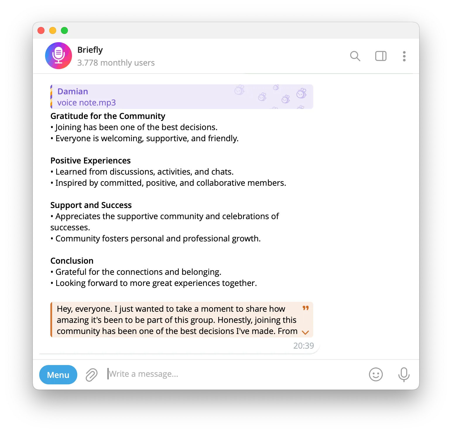 Voice-to-Text Freemium Alternative: @Briefly bot. It transcribes voice and video messages, works in groups, for long audio it makes short summaries, and saves the full transcript as a TXT file.