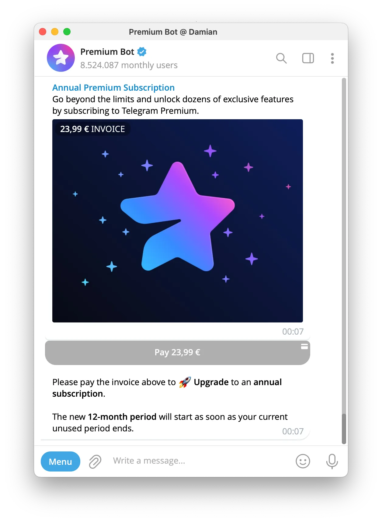 Telegram also offers an annual subscription option at a discounted rate – in the US an annual plan is about $35.99 per year (which is roughly a 40% discount vs paying monthly).