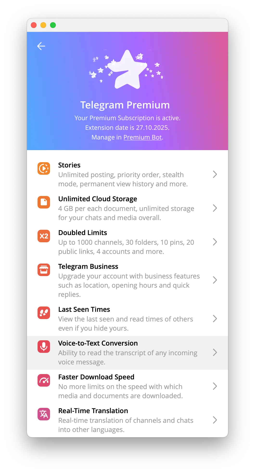 Premium unlocks voice message transcription – you can convert voice messages to text instantly. This also works for video messages, helping you read voice/video messages when you can’t listen.