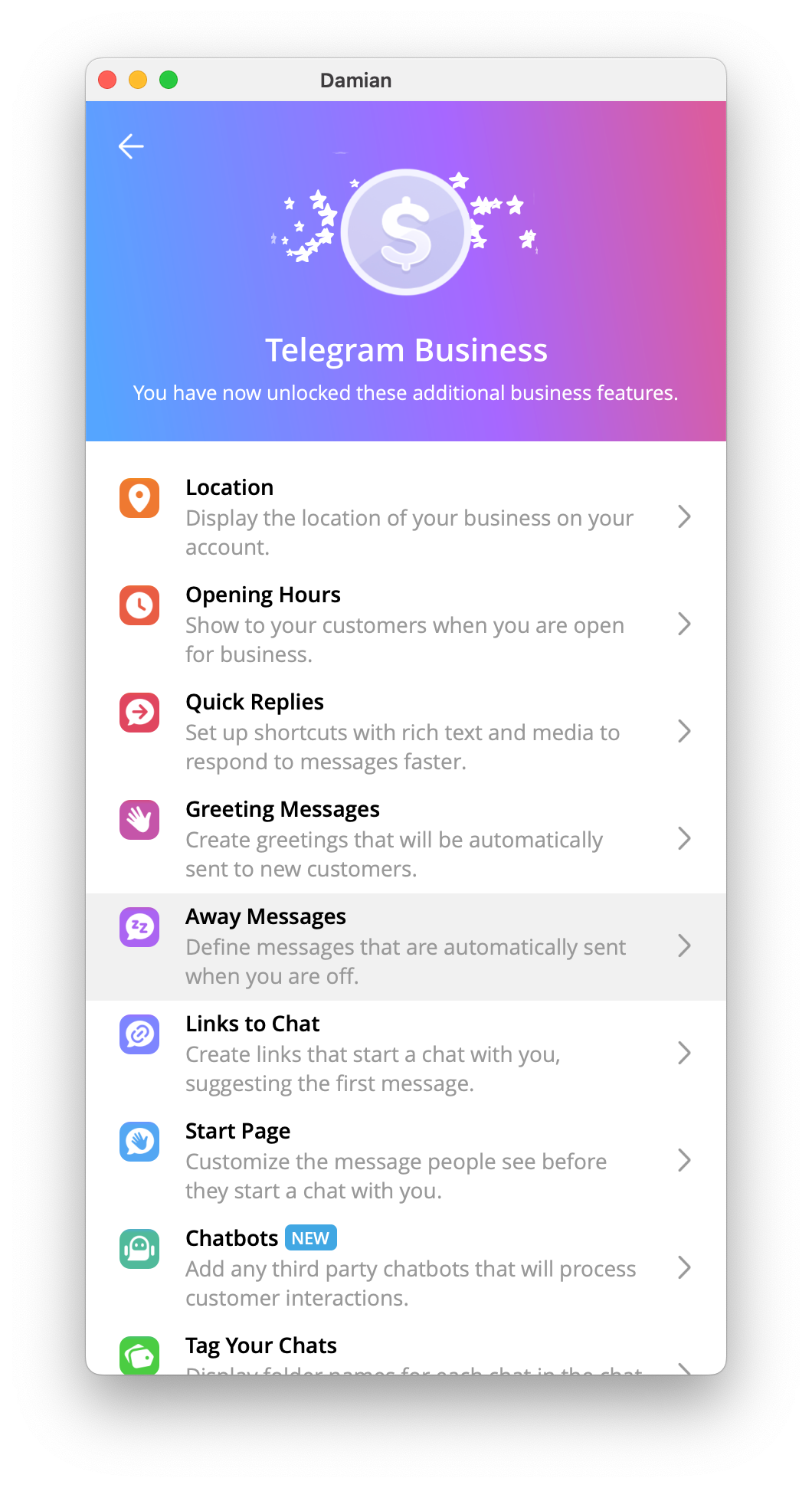 These features are available to Telegram Premium users, which is Telegram paid service. However, you can also use other free Telegram tools and further enhance your Telegram Business experience.